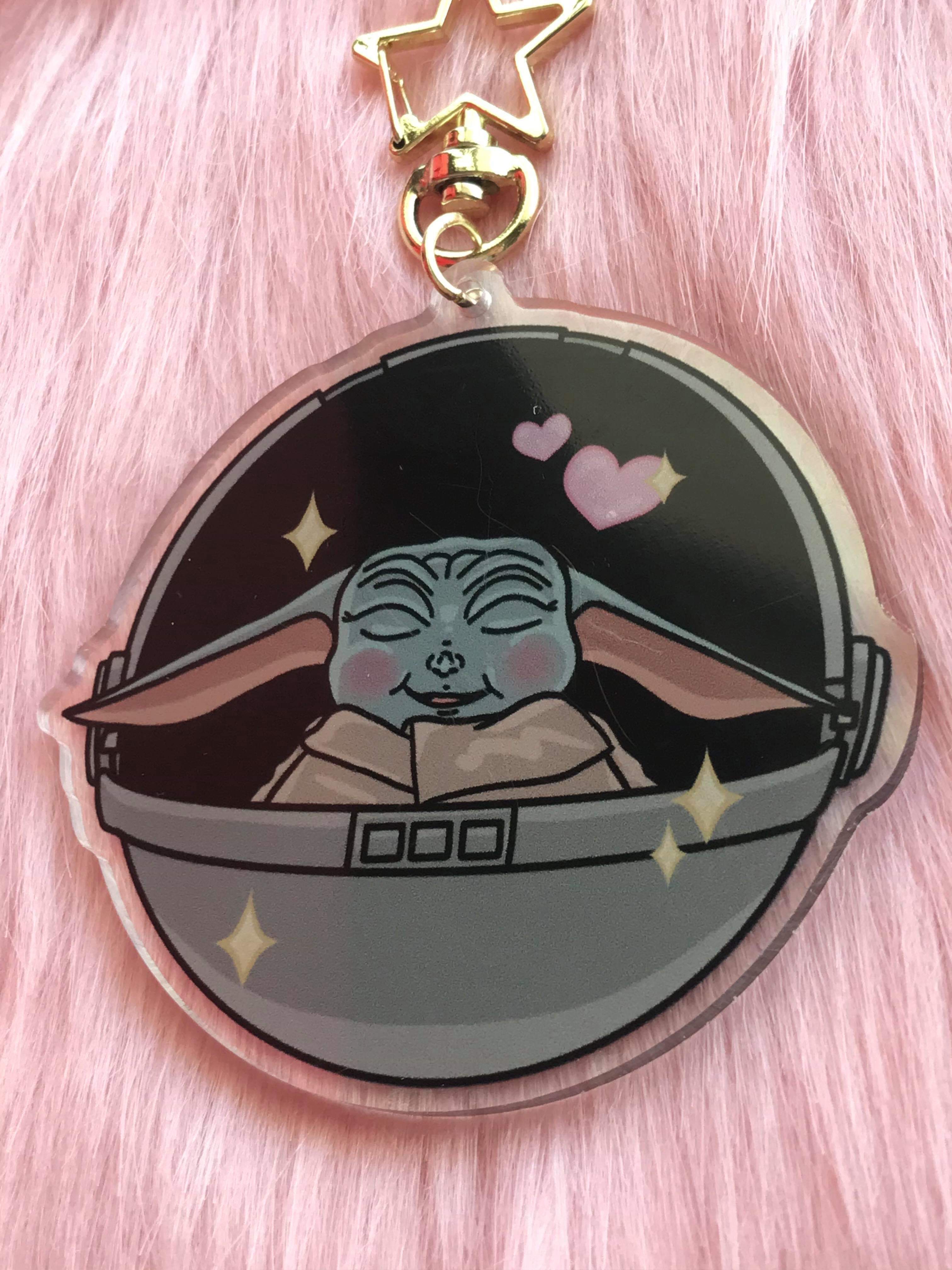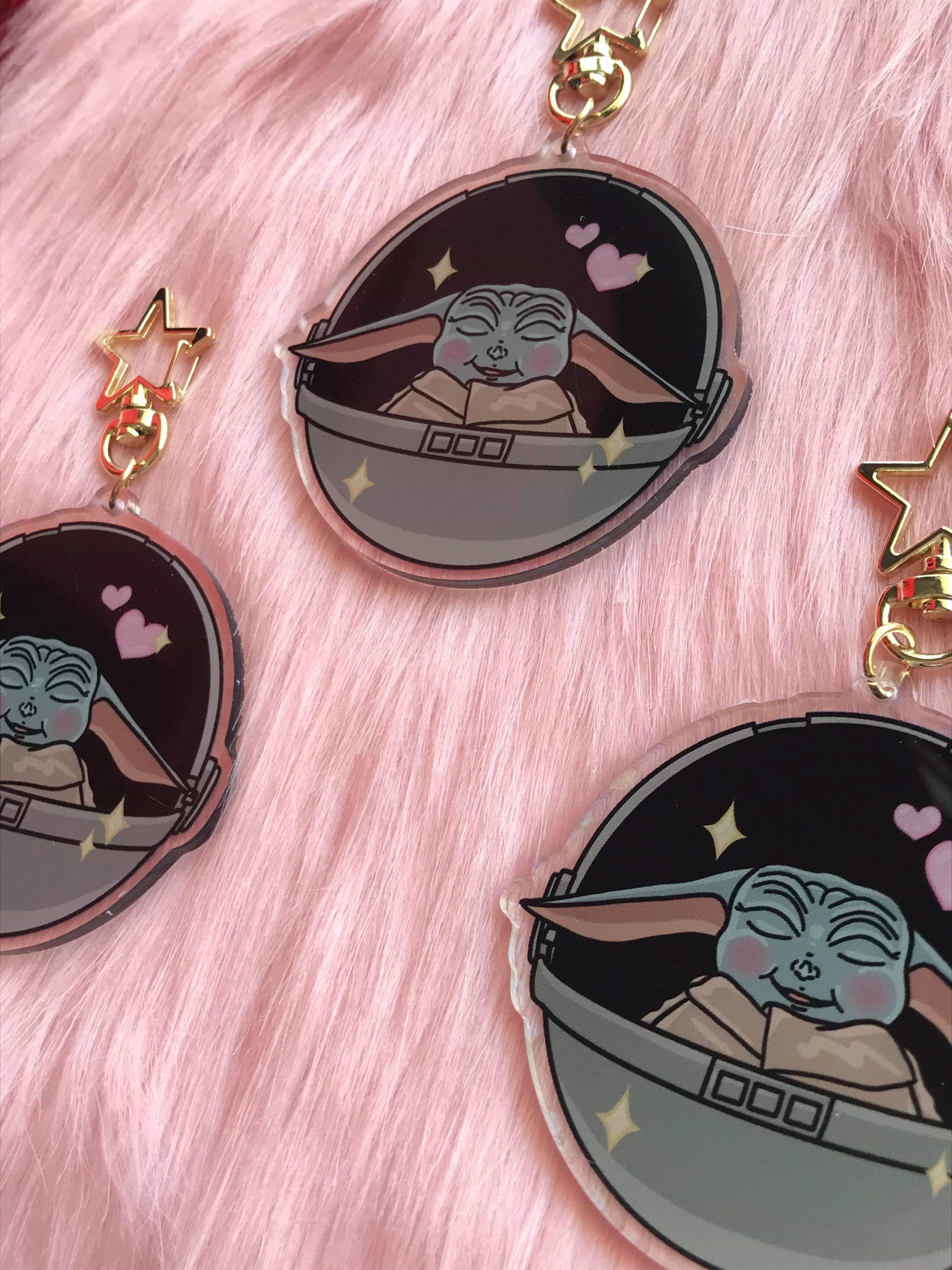 Happiest little camper on this side of the galaxy! Like most of the internet, we are absolutely enamored with Baby Yoda, so we turned him into this adorable holographic acrylic keychain so he can accompany you on all of your adventures!