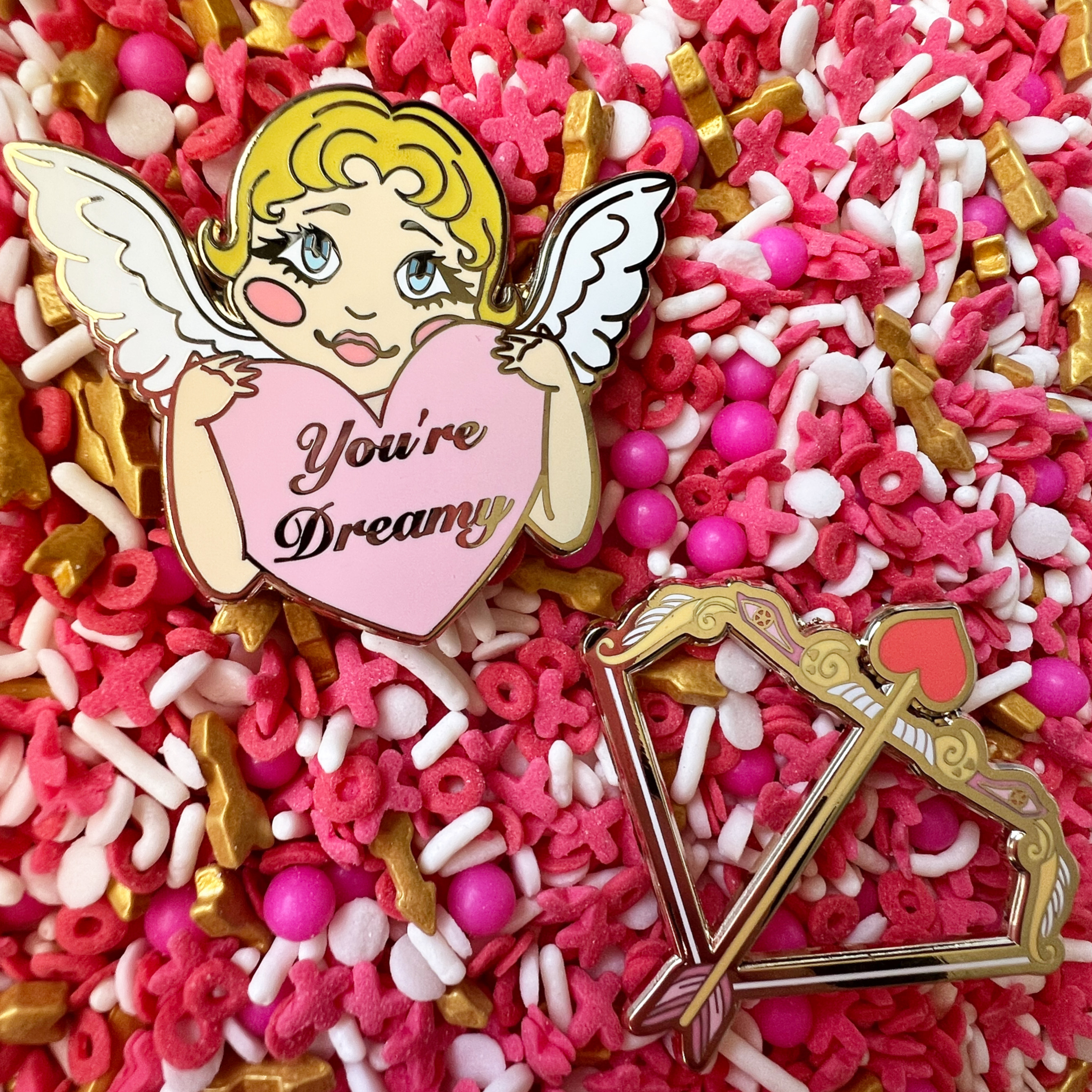 Watch out for Cupid's arrow! This 2" gold plated hard enamel pin featuring raised gold details and our Cupid's Trinkets back stamp. *PREORDER. Details on shipping date coming soon*