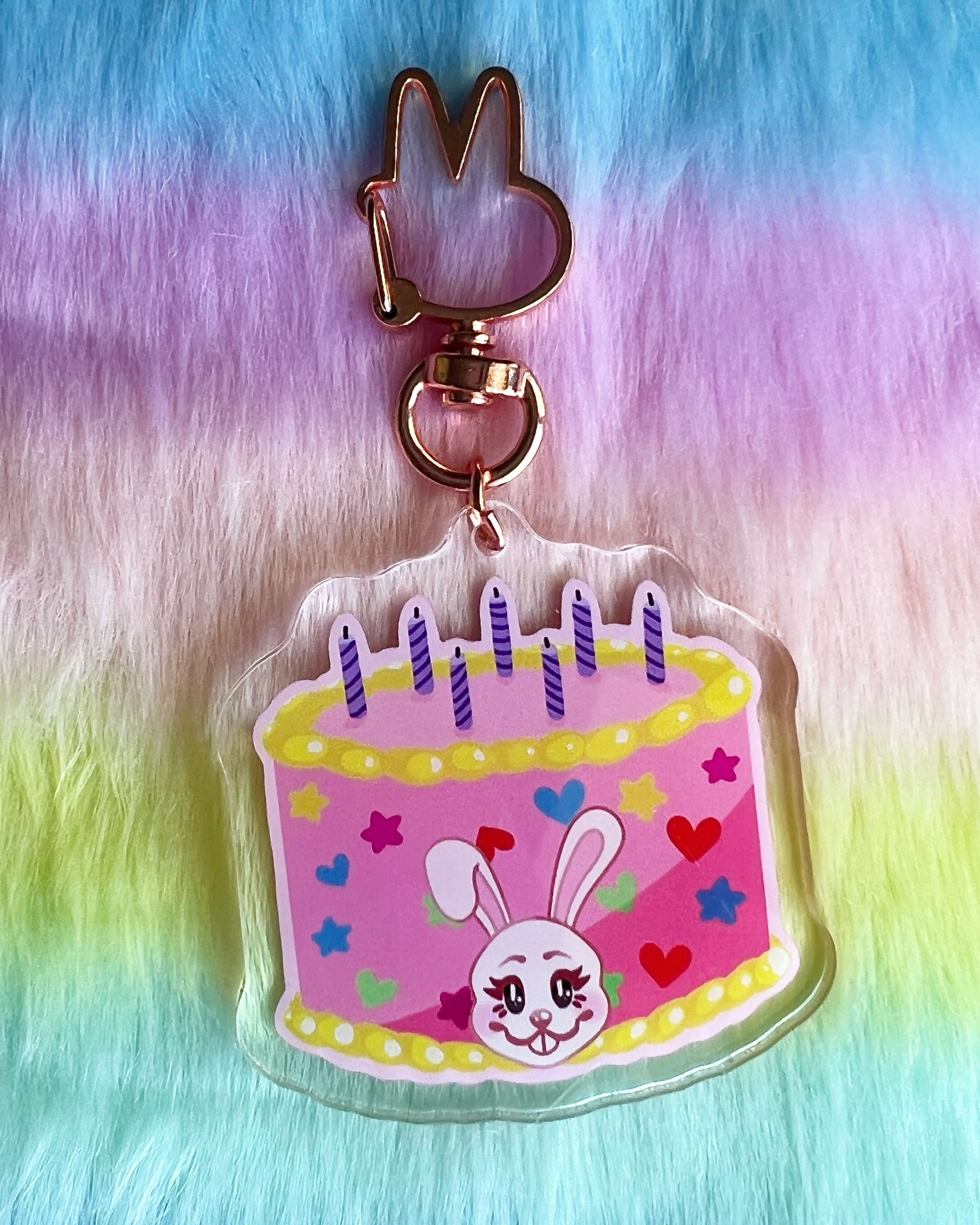 This adorable bunny cake keychain inspired by the cake in Max and Ruby is 2" in size. It's a double-sided acrylic keychain and comes with a matching bunny clip to keep the whole aesthetic together no matter how you choose to display it!