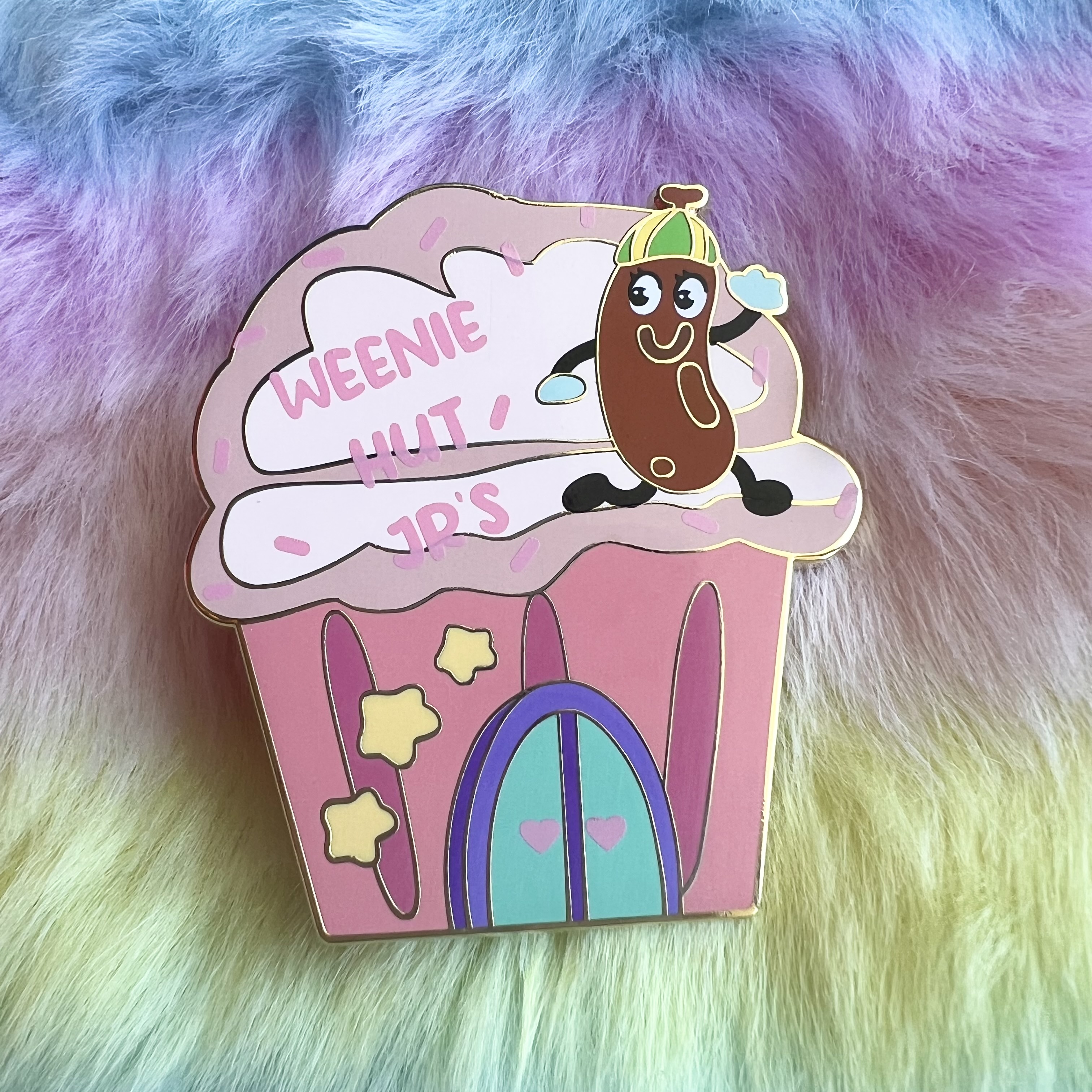 This Weenie Hut Jr. pin is a hard enamel 2" pin that features screen printed details and our Cupid's Trinkets back stamp. *THIS IS FAN ART*